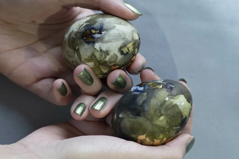 Hauptinspiration für mich ist japanisches Kintsugi, vorrangig das gestalterische Element. Die künstlerische Aufwertung durch unregelmäßig verlaufende vergoldete Bruchlinien greife ich auf und setze sie in abgewandelter Form mit meinen Ostereiern um. Ich integriere metallisch glänzende, dreidimensionale Linien als dekorative Elemente in die Musterung der Ostereier, gebe damit den Mustern Konturen.